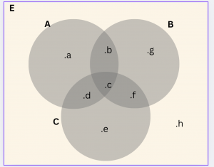 \[ B \cap C = \{ c, f \} \;\; \text{ve } \;\; A= \{ a,b,c,d \} \]