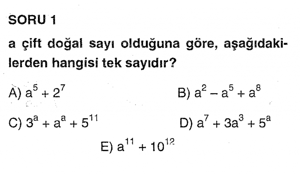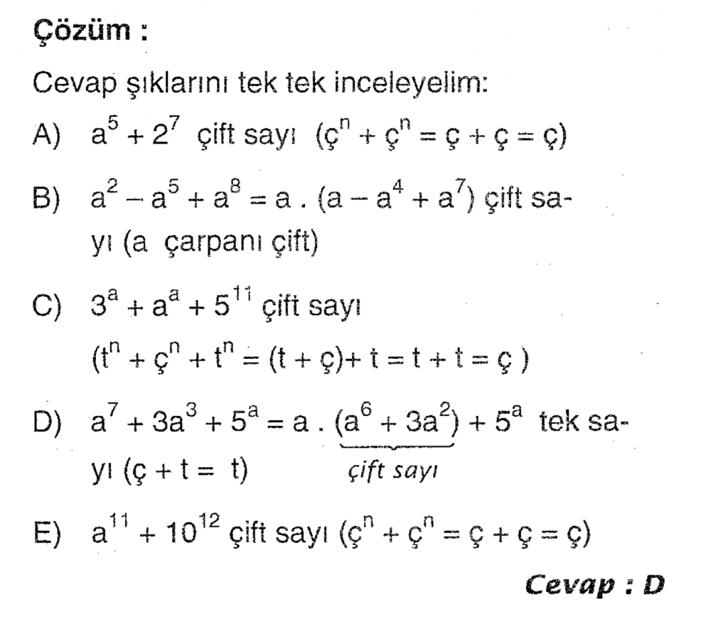 n bir tam sayi olmak üzere $$6\cdot n^3 + 7^3, \quad 5^4-6^7+10\cdot n,\quad 2\cdot n^5+12,\quad 8\cdot n^6, \quad 11\cdot n^4, \quad n\cdot 7^3$$ sayılarının tek veya çift olup olmadığını kesin olarak bilinip bilinmeyeceğini bulalım. Herhangi bir sayı, bir çift sayı ile çarpıldığında sonuç çift sayı olacağından; $$6. n^3 ,\quad 10. n,\quad 2. n^5,\quad 8. n^6 \quad sayıları\quad ve \quad6^7$$ sayısı çift sayı, $$7^3 \quad ve \quad 5^4$$ sayıları da tek sayı olduğundan
