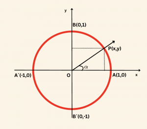 Birim çemberin denklemi \( x^2 + y^2 = 1 \), \( \quad   x = \cos \alpha \quad   \) ve \( \quad   y = \sin \alpha \quad    \) olduğundan,