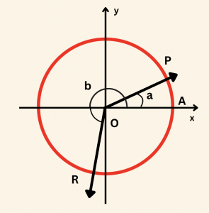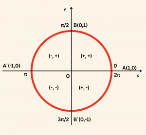 yukarıdaki birim çemberde A, B, A’, B’ noktaları kullanılarak trigonometrik oranlar: