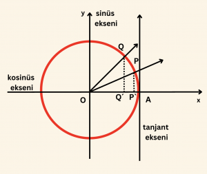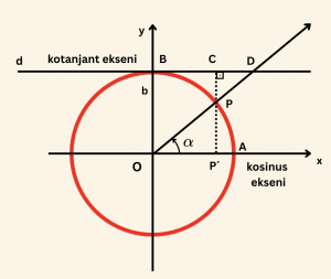 Bir \( \alpha \) açısının bitim kenarının birim çemberi kestiği noktanın apsisi \( \cos \alpha \), ordinatı da \( \sin \alpha \) olduğundan;