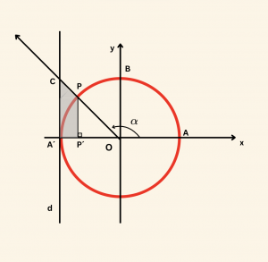 Yandaki şekilde  d doğrusu birim çembere  A’  noktasında teğettir. \( m(A\hat{O}P) = \alpha \) olduğuna göre,  A’P’PC yamuğunun alanı aşağıdakilerden hangisine eşittir?
