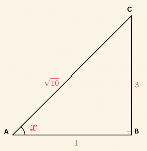 \sin x =     \frac{|BC|}{|AC|} =  \frac{3}{\sqrt{10}}