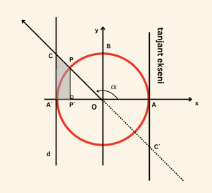 \( |OP’| = -\cos \alpha \)  ve  \( |A’P’| = 1 \; – \; (\;-\cos \alpha) = 1 + \cos \alpha \)
