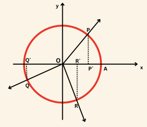 yukarıdaki birim çemberde A, B, A’, B’ noktaları kullanılarak trigonometrik oranlar:
