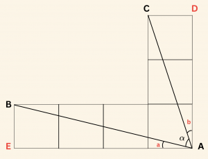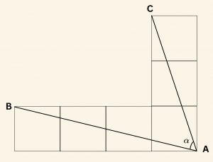 \[\begin{aligned}\tan \alpha = \tan (b \; – \; a) &= \frac{\tan b \; – \; \tan a}{1 + \tan b \cdot \tan a}\\ \\ &= \frac{2 \; – \; \frac{1}{2}}{1 + 2 \cdot \frac{1}{2}} \\ \\ &= \frac{\frac{3}{2}}{2} \\ \\ &= \frac{3}{4} \end{aligned}\]