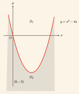 Parabol düzlemi \(D_1\) ve \(D_2\) olmak üzere iki düzleme ayırır. \(D_2\) düzlemi içinden seçilen \(A(0,\ -5)\) noktasının koordinatlarının eşitsizliği sağlayıp sağlamadığına bakalım: