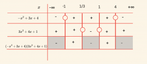 \(-x^2 + 3x + 4)(3x^2 – 4x + 1) > 0 \) eşitsizliğinin çözüm kümesini bulalım.