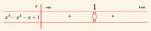 Burada 1, üç kez elde edildiğinden çift katlı kök değildir. Pay ve paydadaki polinomların en büyük dereceli terimleri \( (x^4), (-x^3), (x^2) \) nin katsayılarının işaretleri çarpımı \( (+) \cdot (-) \cdot (+) = (-) \) dir.