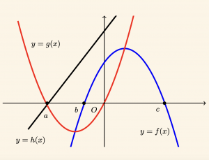 Yukarıdaki şekilde \( y = f(x) \) ve \( y = g(x) \) parabolleri ile \( y = h(x) \) doğrusu verilmiştir. Buna göre